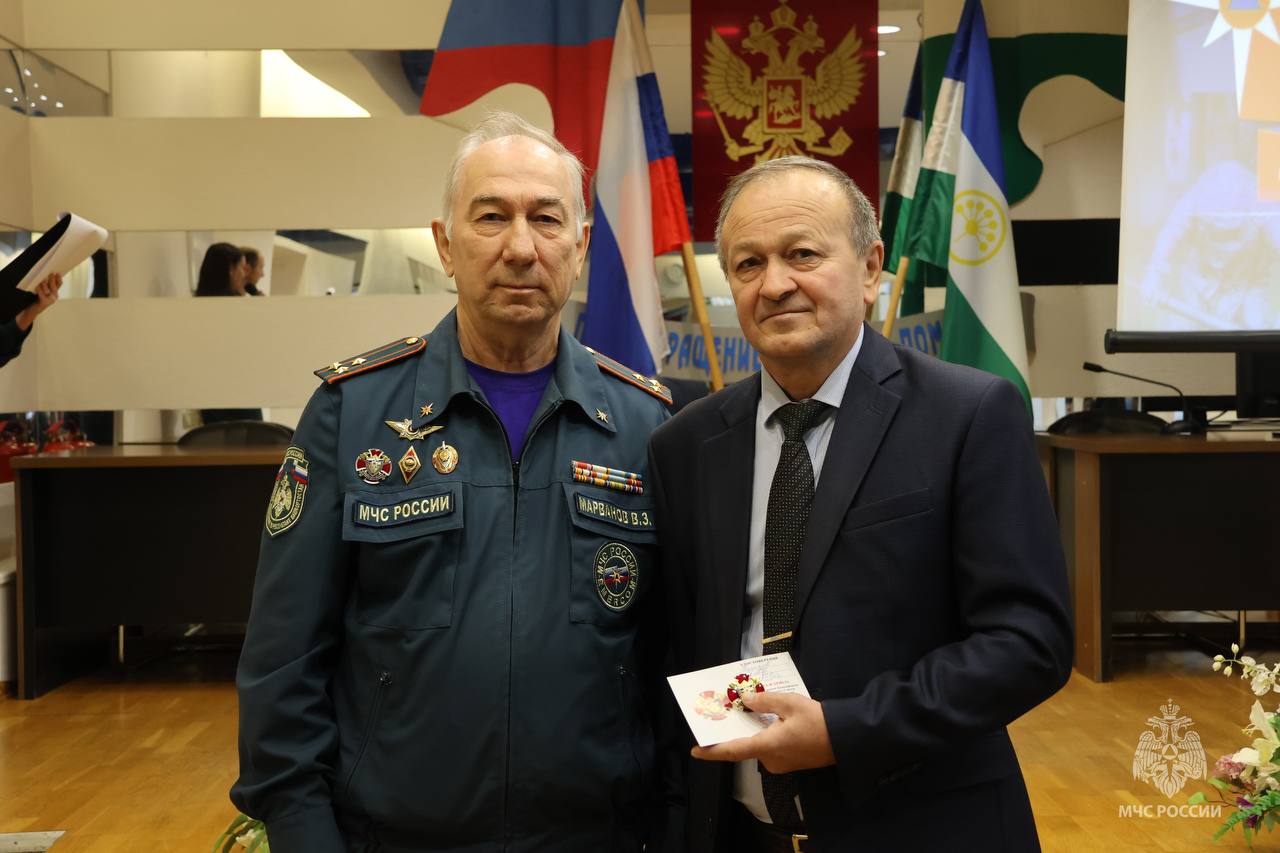 Председатель Башкирского республиканского совета ветеранов МЧС России Валерий Марванов вручил нагрудные знаки «Ветеран МЧС России», отметив большой вклад ветеранов в дело развития и становления системы гражданской обороны.