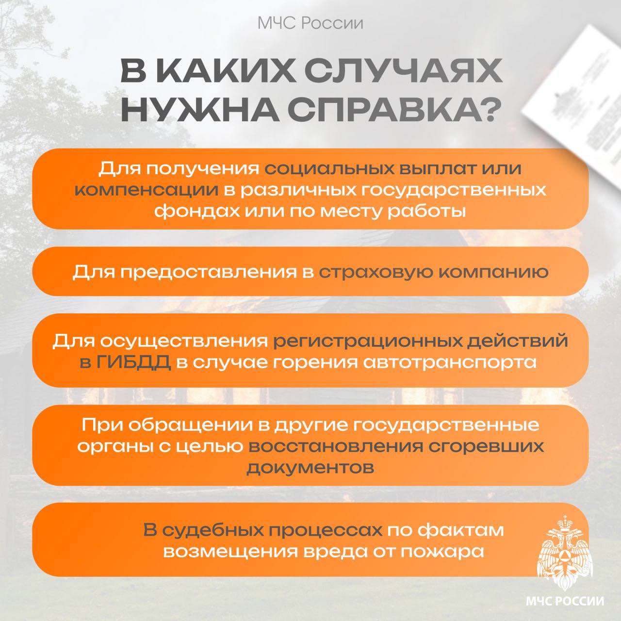На портале «Госуслуг» можно воспользоваться функцией «Предоставление справки, подтверждающей факт возникновения пожара». Для чего необходима справка - смотри в памятках МЧС России.