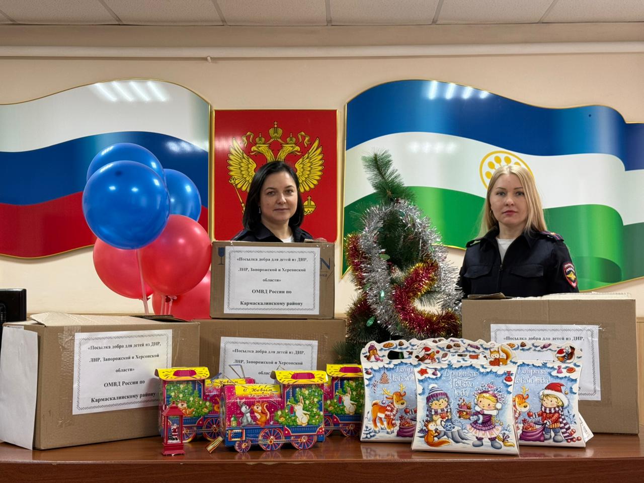 Посылка добра для детей ДНР, ЛНР, Запорожской и Херсонской области". ОМВД России по Кармаскалинскому району спешит поздравить каждого ребенка с наступающим Новым Годом!
