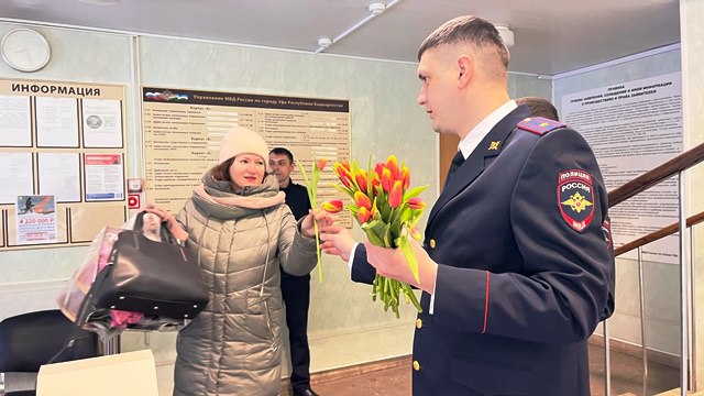 Сегодня утром при входе в здание Управления МВД России по городу Уфе мужчины – полицейские вручали представительницам прекрасного пола цветы. Офицеры поздравили девушек и женщин, желая им счастья, благополучия, крепкого здоровья и отличного весеннего настроения.