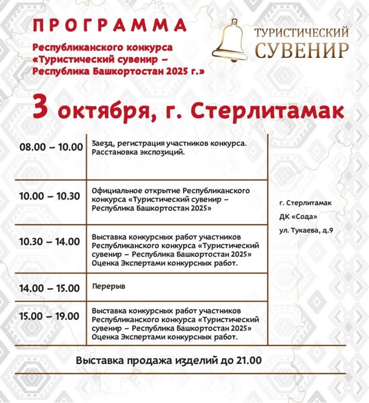 Со 2 по 4 октября в Стерлитамаке в Городском Дворце культуры «Сода» (ул.Тукаева, 9) пройдёт финал Республиканского конкурса «Туристический сувенир – Республика Башкортостан».2 октября состоится регистрация участников и установочная...