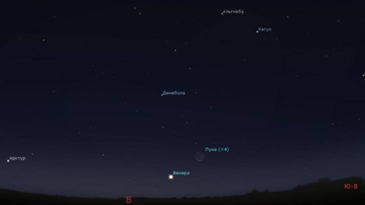 Небесные светила будут видны завтра в 06:30. Очень яркая Венера и тонкий лунный серпик можно увидеть на востоке низко над горизонтом в созвездии Девы.