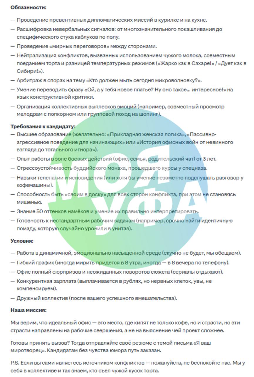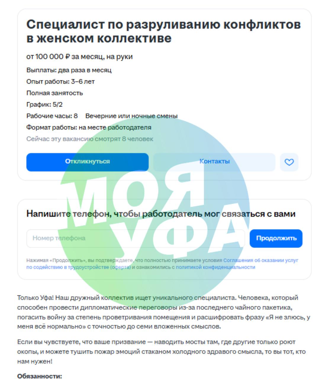 Пока разные компании ищут тимлидов и менеджеров, одна уфимская фирма решила пойти дальше и опубликовала, пожалуй, самую честную вакансию сезона: «Специалист по разруливанию конфликтов в женском коллективе».