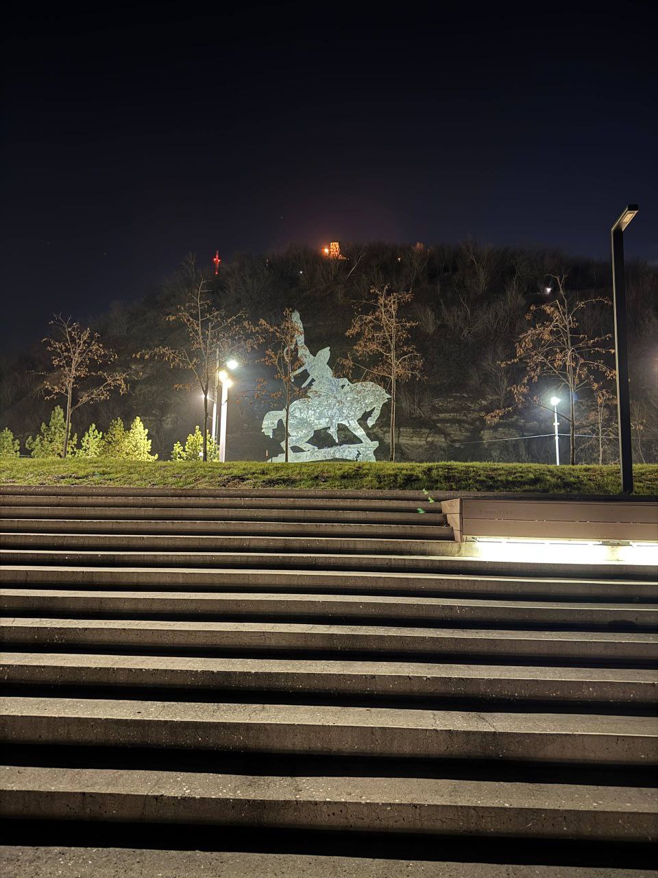 В качестве временного арт-объекта на склоне горы была запущена световая проекция национального героя.