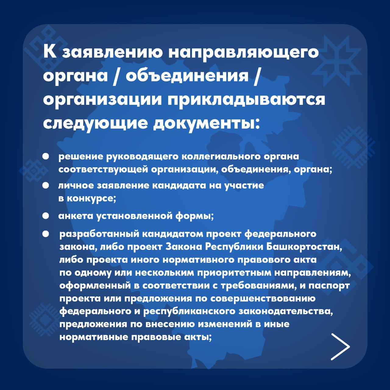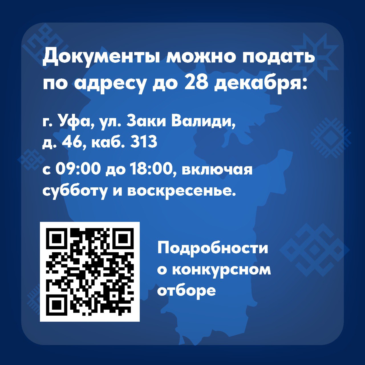 Важно: документы принимаются в бумажном виде и при личном участии кандидата по адресу: г. Уфа, ул. Заки Валиди, д. 46, каб. 313 с 09:00 до 18:00 (включая выходные).