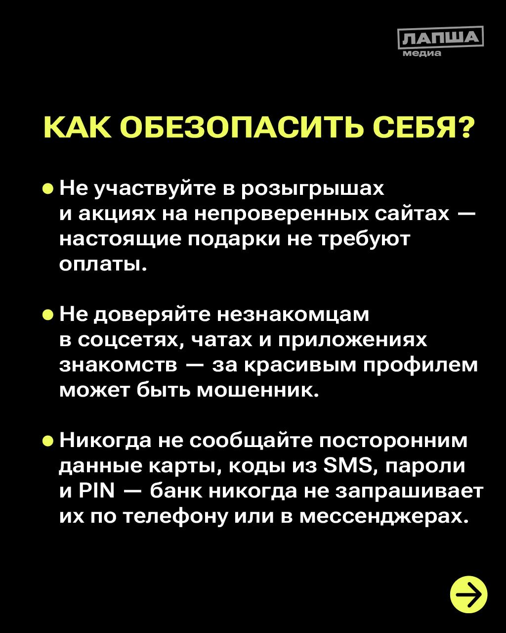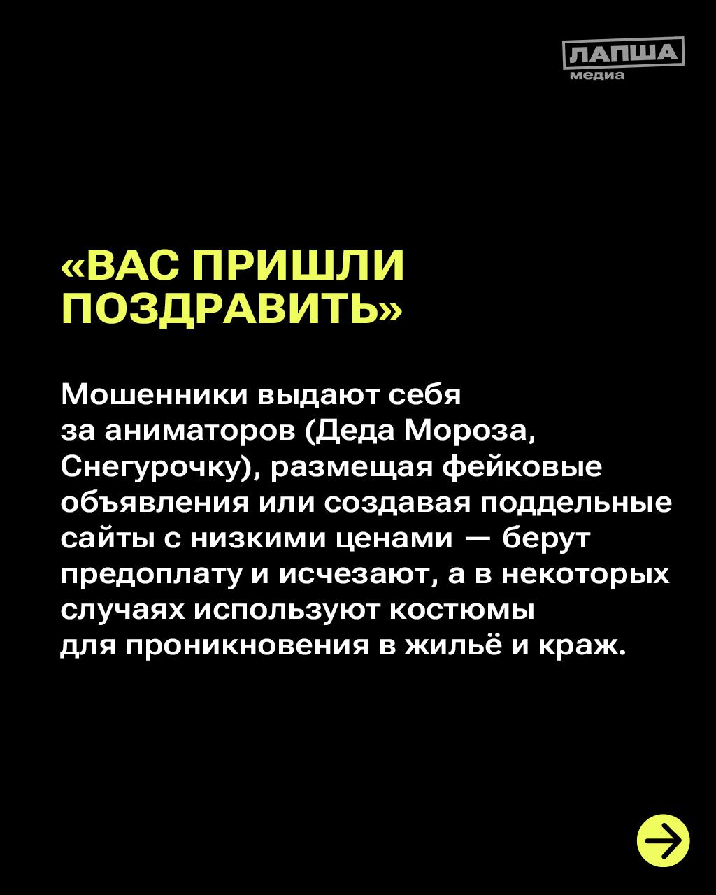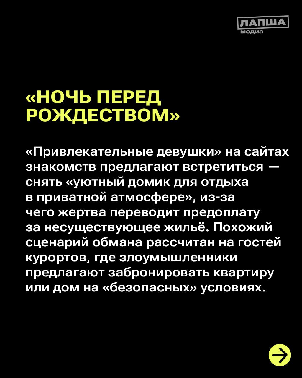 Это уже вторая часть, в которой мы рассказываем об уловках, которые чаще всего используют аферисты под конец года. Подробнее в карточках.