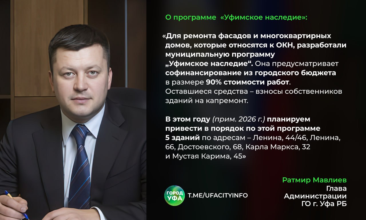 Мэр Уфы Ратмир Мавлиев сообщил, что в 2024 г. к 450-летию города отремонтировали фасады 19 объектов культурного наследия (ОКН), а в 2025 г. отреставрировали четыре исторических здания: