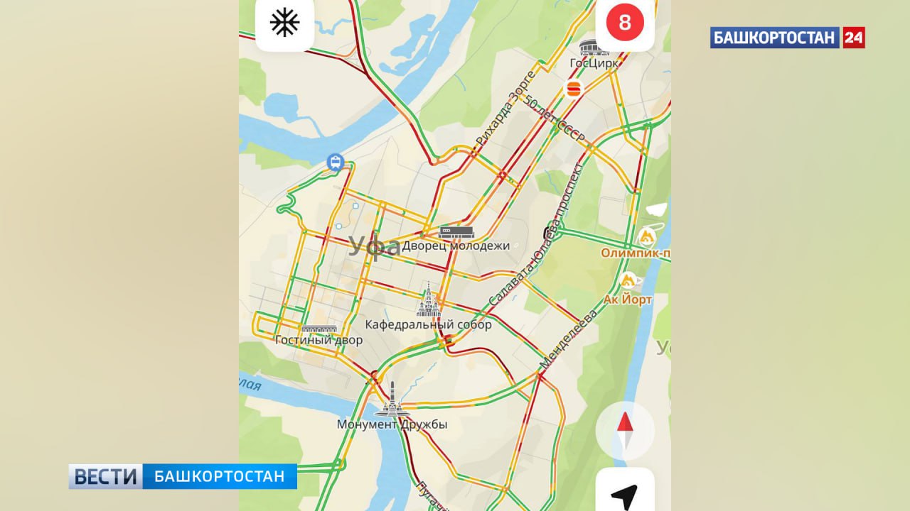 В Уфе сегодня наблюдаются серьёзные пробки. Уровень загруженности дорог оценивается в 8 баллов. Наибольшие затруднения в движении отмечены на улицах Рихарда Зорге, Менделеева, Пугачева, а также на проспекте Салавата Юлаева.