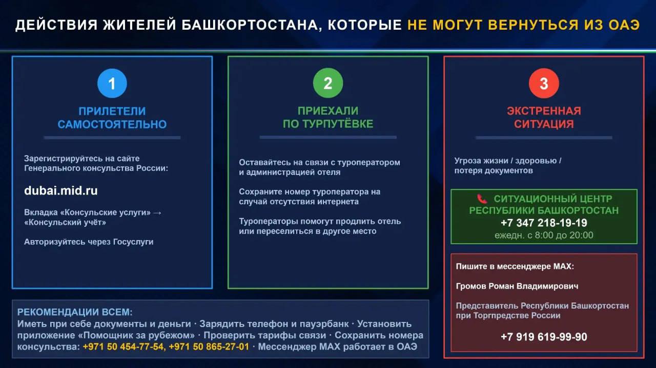 Для экстренных обращений можно связаться с представителем Башкортостана при Торговом представительстве России Романом Громовым. Связь через MAX: +7 919 619 99 90.