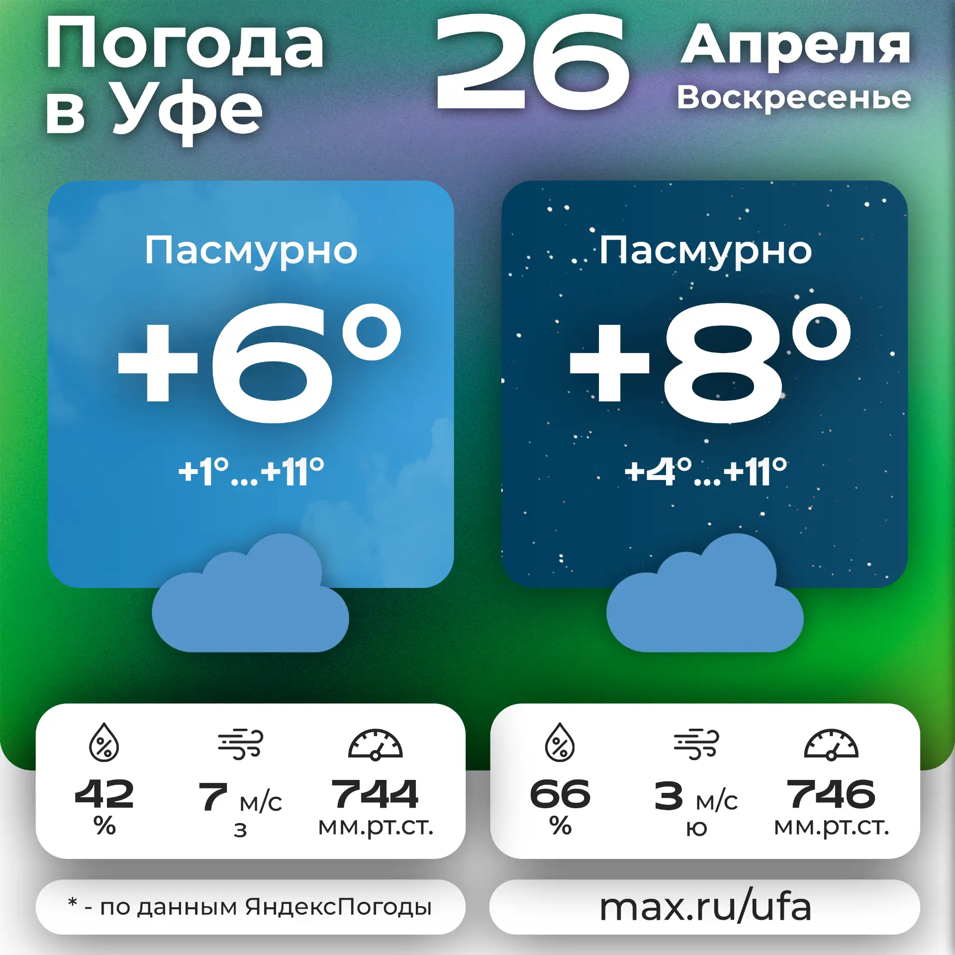 По данным Башгидромета, сегодня ожидаются небольшие осадки в виде дождя и мокрого снега, местами до умеренных. Температура воздуха составит +7, +12 °С. Ветер юго-западный, западный умеренный, местами порывы до сильного.В понедельник...
