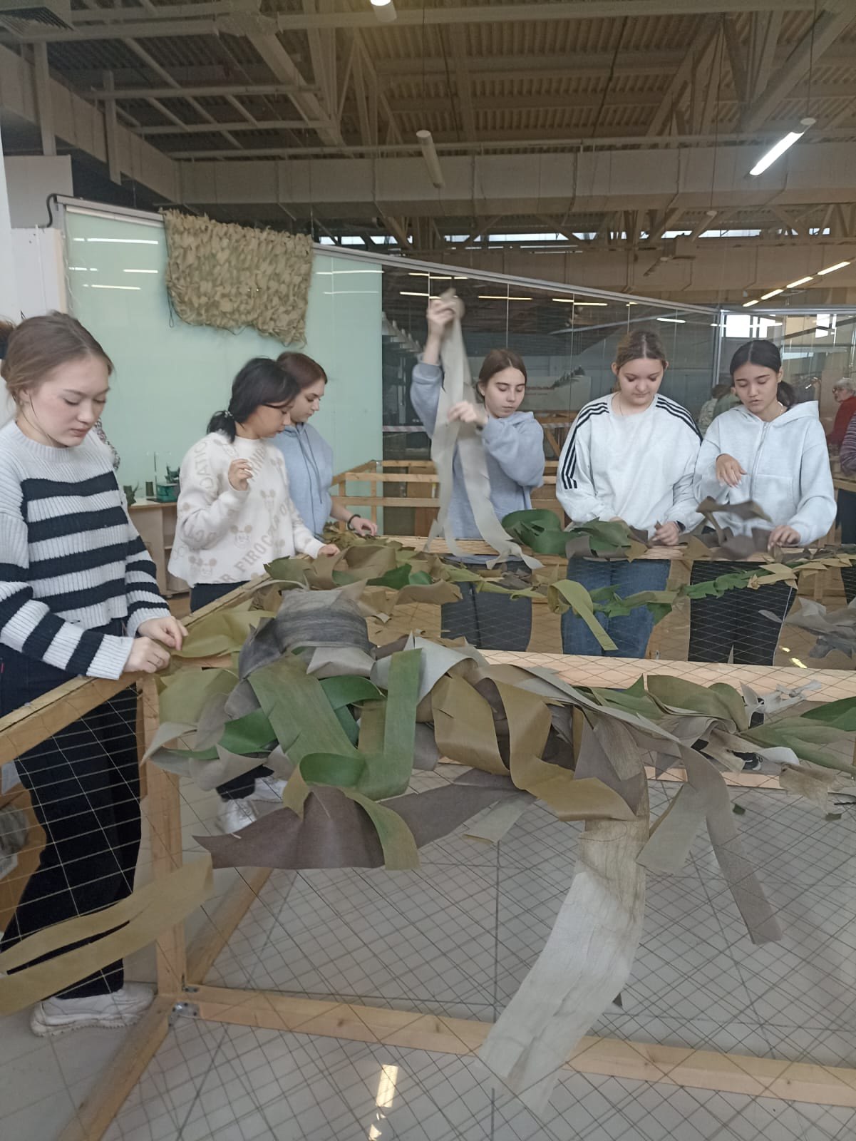 Студенты СМПК ДО-37 ( дошкольное образование) с преподавателем М.М.Воробьёвой помогли волонтерам плести маскировочные сети на площадке «Вместе к Победе России».