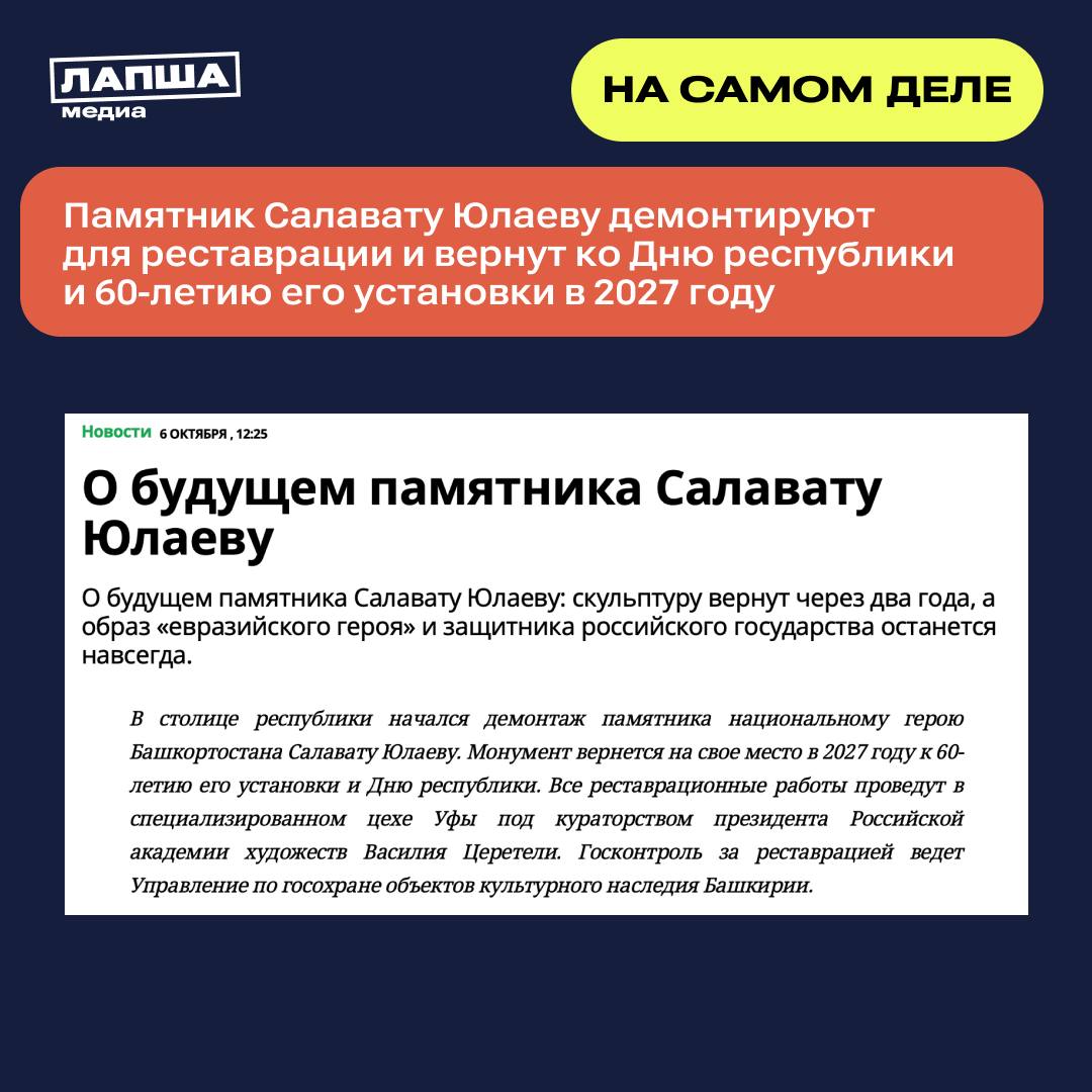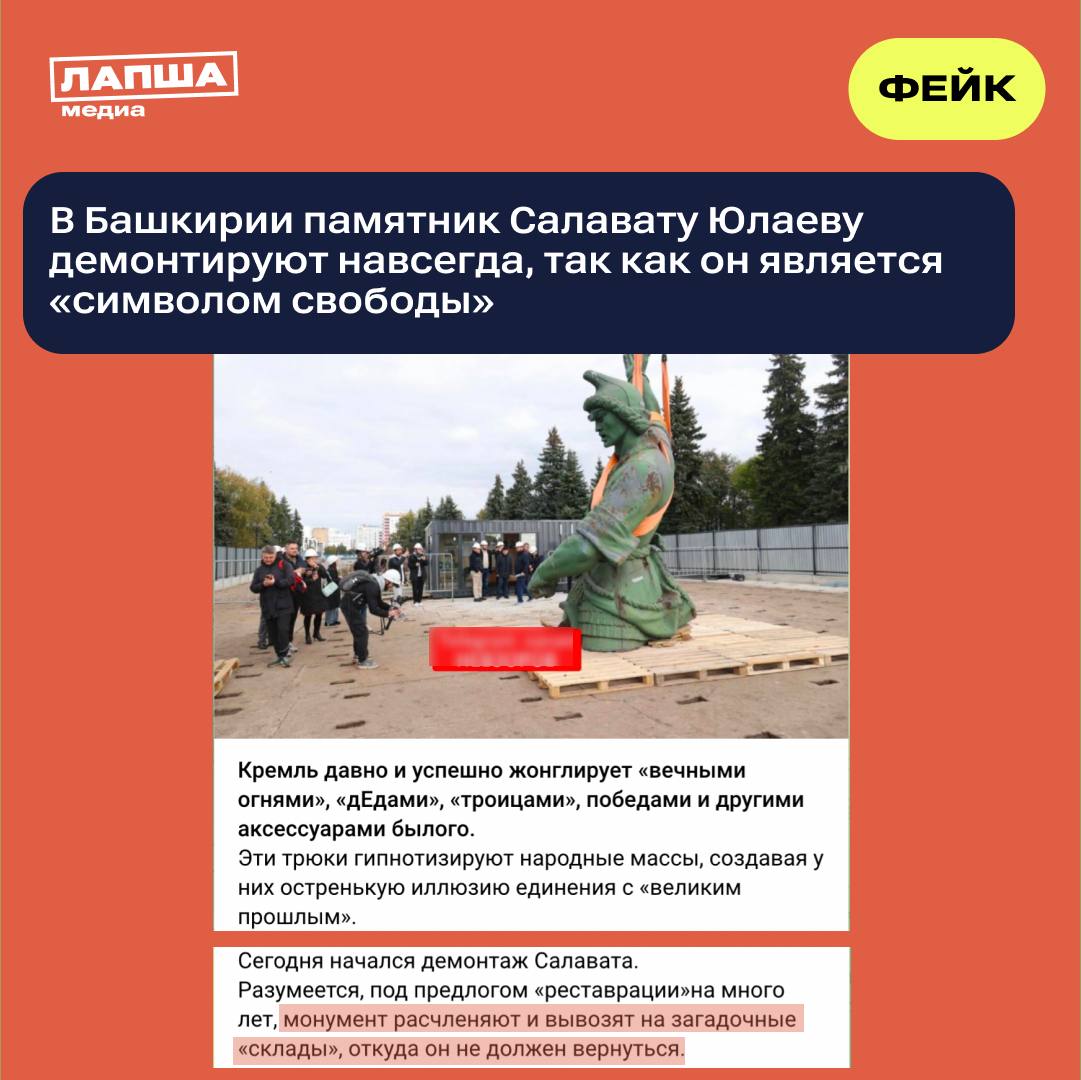В Уфе памятник национальному герою Салавату Юлаеву демонтируют якобы по политическим причинам. Информация появилась в канале российского репортера и политика, признанного иноагентом.