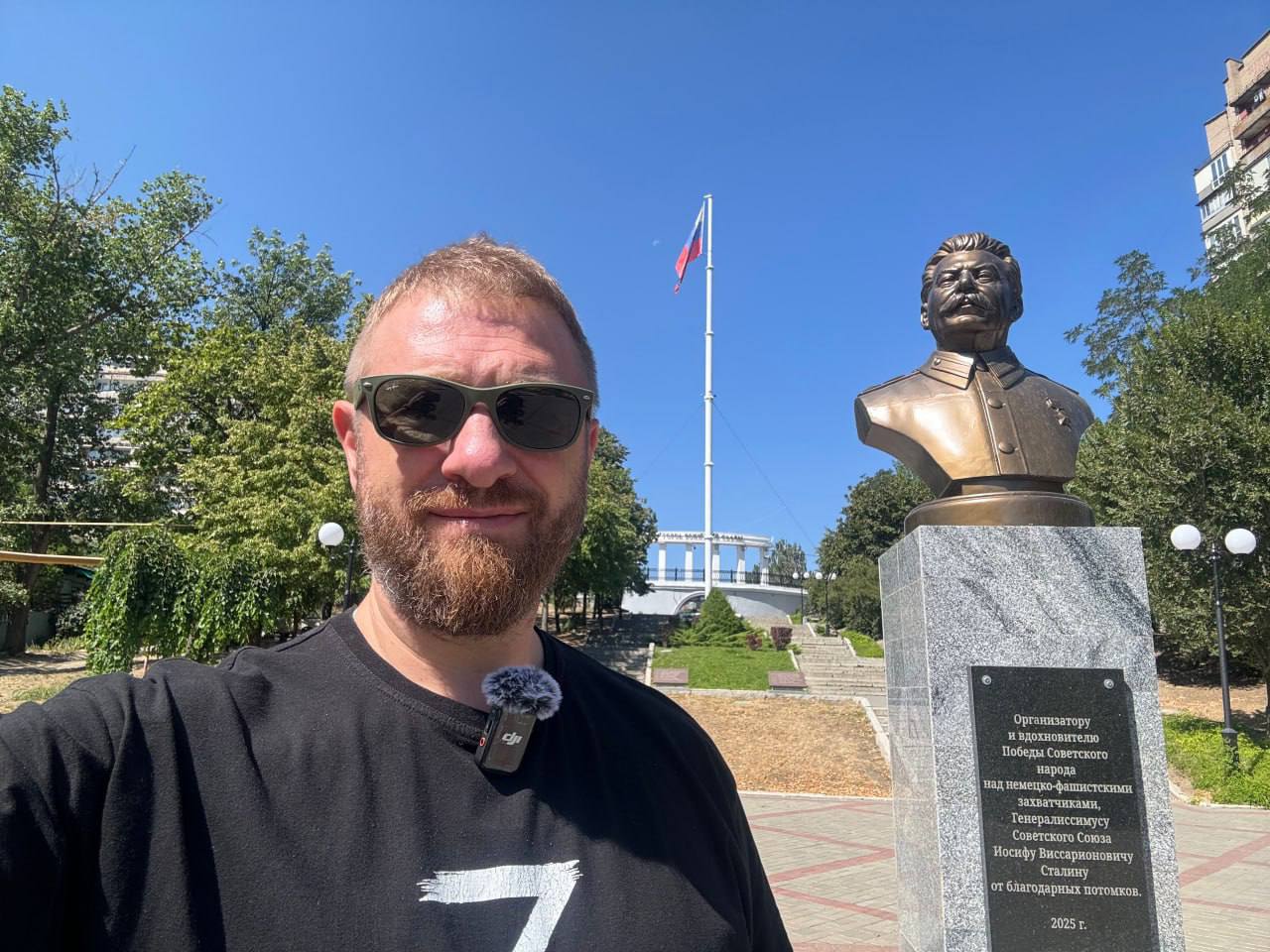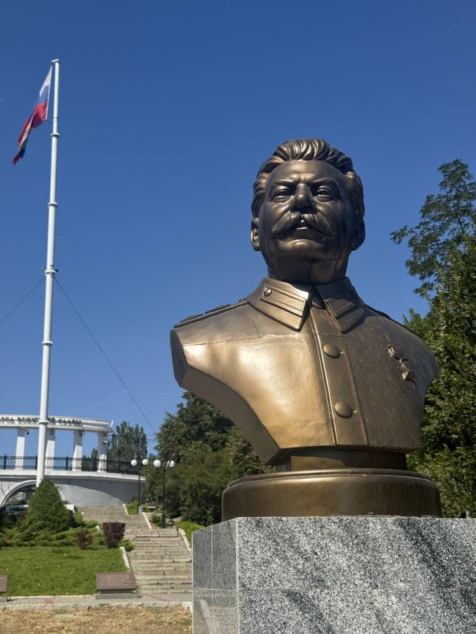 Первым делом – бюст Иосифа Виссарионовича Сталина, открытый 8 мая 2025 года. На памятной доске слова: