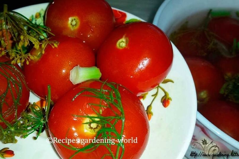 Первым делом помидоры нужно тщательно вымыть и обсушить, затем сделать в них несколько проколов зубочисткой, чтобы они лучше впитали рассол. На дно литровой банки или салатницы укладываются половина укропа и нарезанные зубчики чеснока. Затем помидоры укладываются аккуратно до плечиков банки, а сверху продолжается укладка оставшимися приправами.