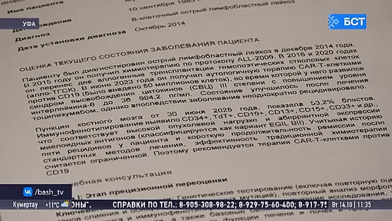 У уфимца Руслана Резяпова острый лимфобластный лейкоз, к 40 годам он перенес пять рецидивов. Сейчас мужчина поехал в Китай в надежде перебороть болезнь. Первоначальный этап лечения стоит порядка 10 миллионов рублей. Какую-то часть семья накопила, но собрать всю сумму не удалось. Как помочь Руслану – в нашем сюжете.