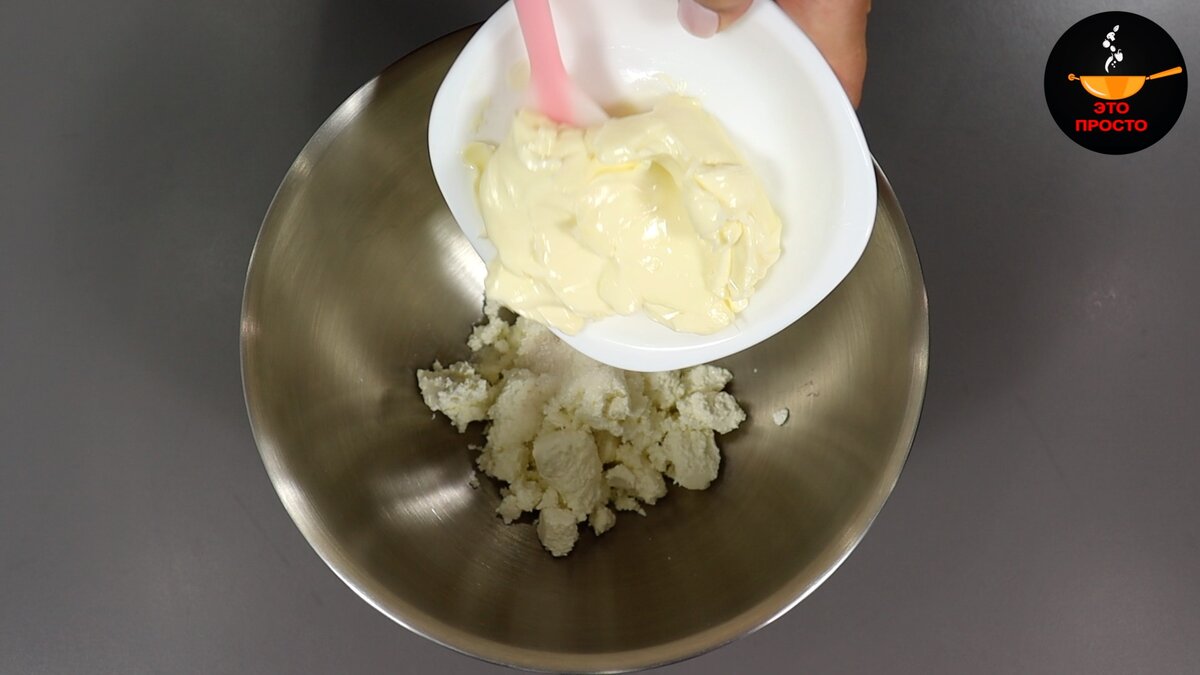 Прежде всего, просеять муку и смешать ее с разрыхлителем. Откладываем в сторону. В глубокую миску помещаем творог, добавляем ванильный сахар и размягченное сливочное масло. С помощью миксера на средней скорости перемешиваем все ингредиенты до однородности.