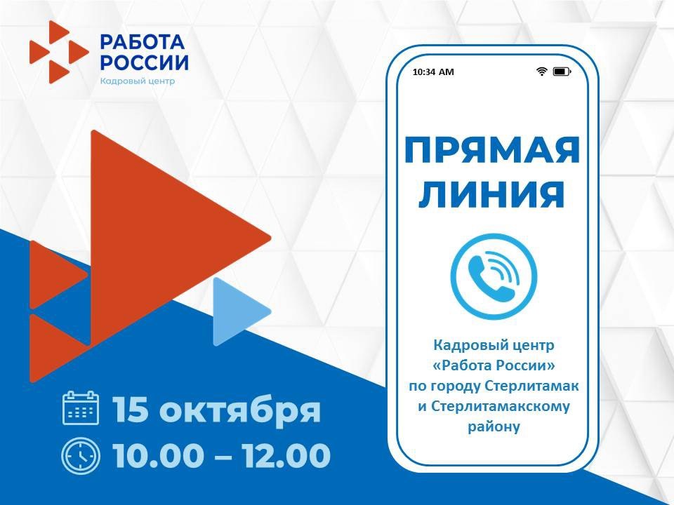 15 октября с 10-00 до 12-00 Кадровый центр "Работа России" по городу Стерлитамаку и Стерлитамакскому району проведет "прямую линию" по вопросам трудоустройства и оказания мер государственной поддержки в сфере занятости населения участникам СВО, ветеранам боевых действий, принимавшим участие в СВО, и членам их семей.