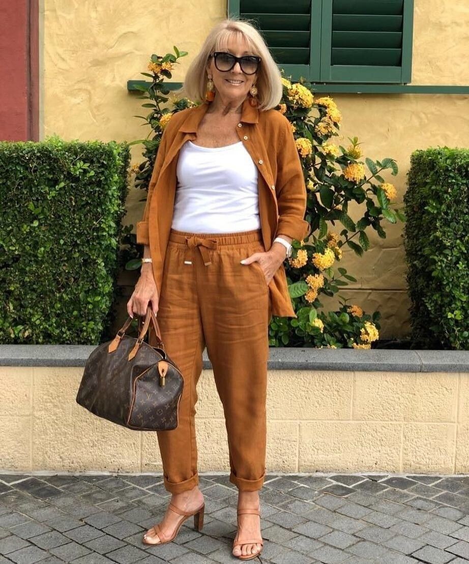 - Льняной кофейно-коричневый костюм: Удлинённая рубашка с рукавами до локтей и зауженные брюки в трендовом цвете не только стильные, но и комфортные. Свежий белоснежный топ и сандалии на устойчивом каблуке идеально дополнят образ.