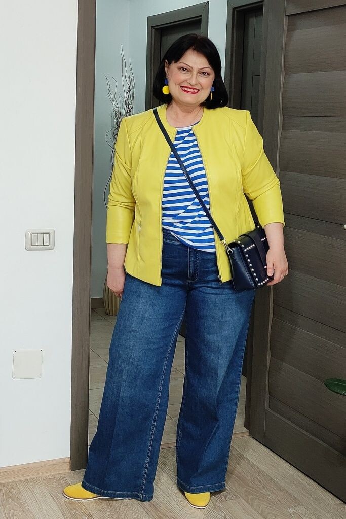 - Комфортные джинсы и яркая куртка: Широкие тёмно-синие джинсы идеально подходят для любого типа фигуры, позволяя скрывать недостатки. В сочетании с "тельняшкой" с коротким рукавом и огненно-жёлтой курткой на молнии, этот образ станет настоящим хитом. Яркая обувь добавит дерзости, а стильные аксессуары — завершат ваш образ.