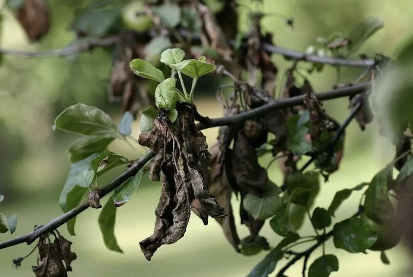 - Листья: внезапное почернение и скручивание, напоминающее последствия огня.