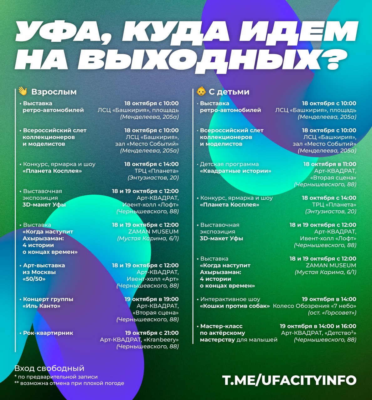 Если афиша стала для вас полезной - поставьте нам . Вам не сложно - а нам приятно и дальше собирать для вас бесплатные мероприятия на выходные