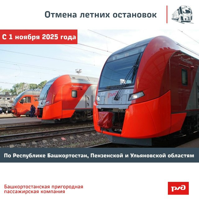 С 1 ноября 2024 года, в связи с окончанием летнего сезона перевозок, вносятся изменения в график движения пригородных поездов на территории Республики Башкортостан