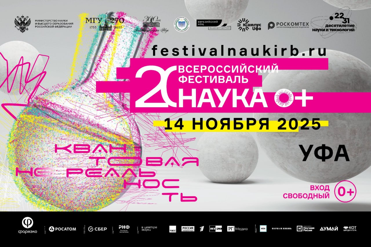 14 ноября в Уфе пройдет XV Всероссийский Фестиваль науки «НАУКА 0+». В этом году он посвящен теме «Квантовые ритмы Башкортостана» и объединит такие направления, как биология и науки о жизни, техника и инженерные науки, физика и астрономия, химия и нанотехнологии, математика и информатика