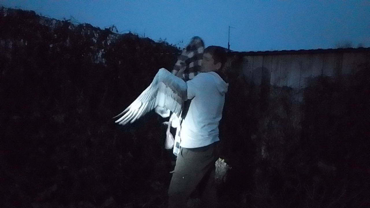 Птица отделилась от родителей и приземлилась во двор одного из домов. Пока не стемнело мама с папой кружили над участком. Их водоем был в 200 метрах. Подходы к нему были сильно заболочены.