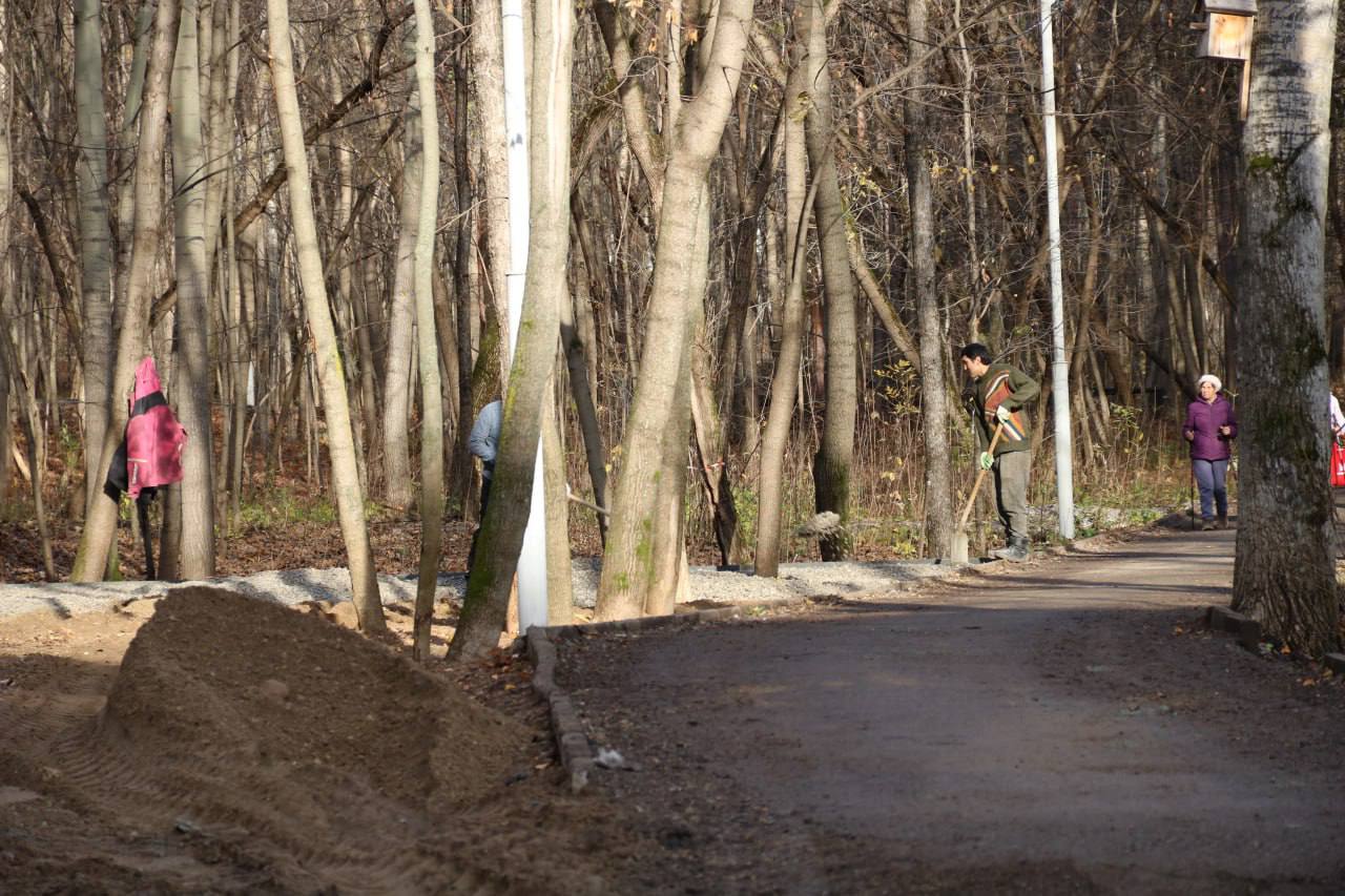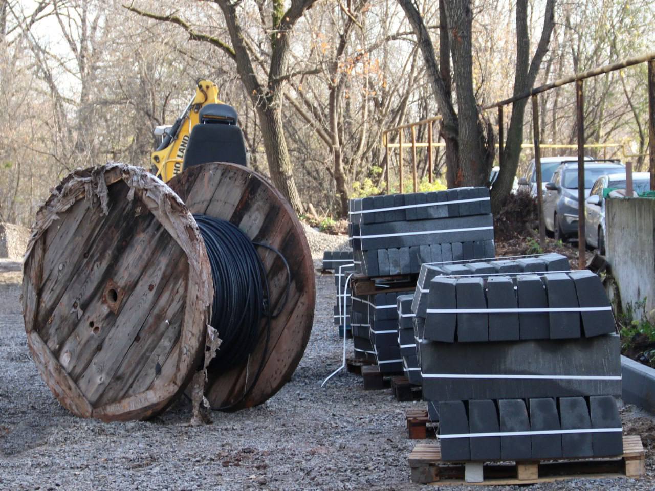 Сейчас рабочие устанавливают бордюры, укладывают гравий и кабель для освещения.