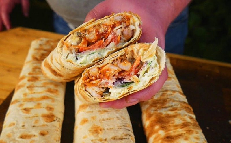 На тонкий лаваш раскладывают нарезанное мясо, сверху выкладывают овощи с соусом и заворачивают. Последний этап – обжарка шаурмы на мангале до готовности. Это блюдо не требует дополнительных гарниров, так как в себе уже объединяет все необходимые вкусы, чтобы составить настоящее кулинарное пиршество.