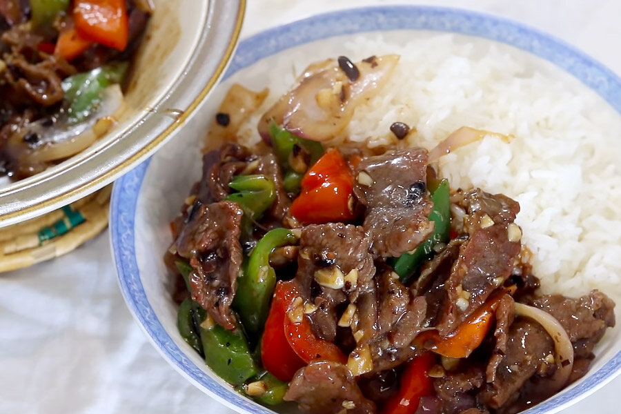 Тем временем накрошите чеснок и слегка порежьте ферментированные бобы. Нарежьте болгарский перец, морковь и лук на небольшие кусочки.
