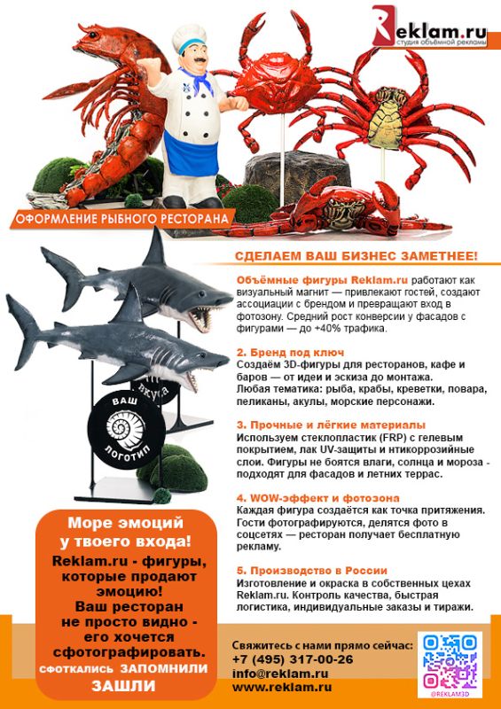 - Создание идентичности бренда: Объемные фигуры помогают максимально быстро донести до посетителей тематику заведения и создать целостный образ относительно питания, будь то морепродукты или другие деликатесы.