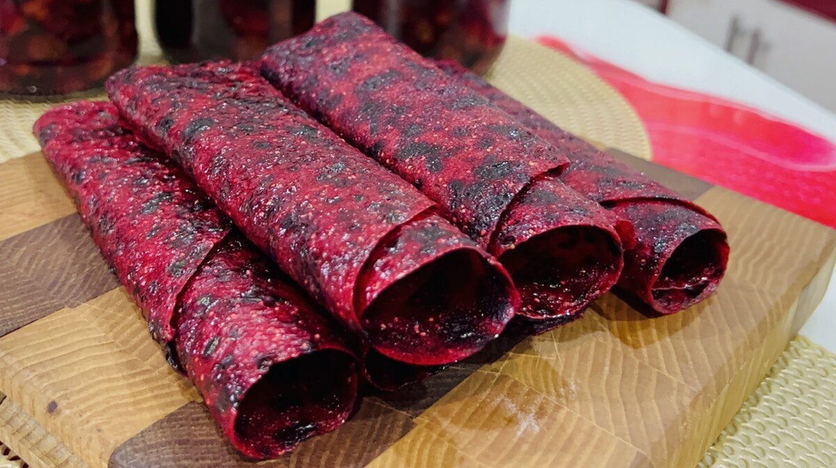 Третий этап — процесс сушки. Установите дегидратор на температуру 55-60 градусов и оставьте маски сушиться на 6 часов. Время может варьироваться в зависимости от модели вашего устройства. Регулярно проверяйте пастилу: она должна стать менее липкой и более упругой.