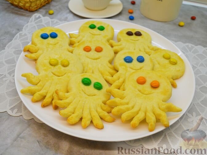 - Оригинальные песочные печенья "Осьминожки". Крафтовое печенье в форме осьминогов восхищает не только своим видом, но и удивительным сливочным вкусом с ванильным ароматом. Укra?енное яркими конфетами-драже, оно станет украшением любого стола.