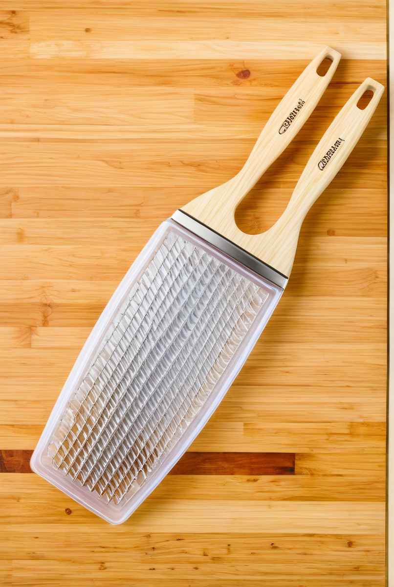 - Скребок с контейнером — удобное устройство, которое предотвращает разброс чешуи по кухне. Все очищенные чешуйки собираются в специальный отсек, что упрощает уборку.