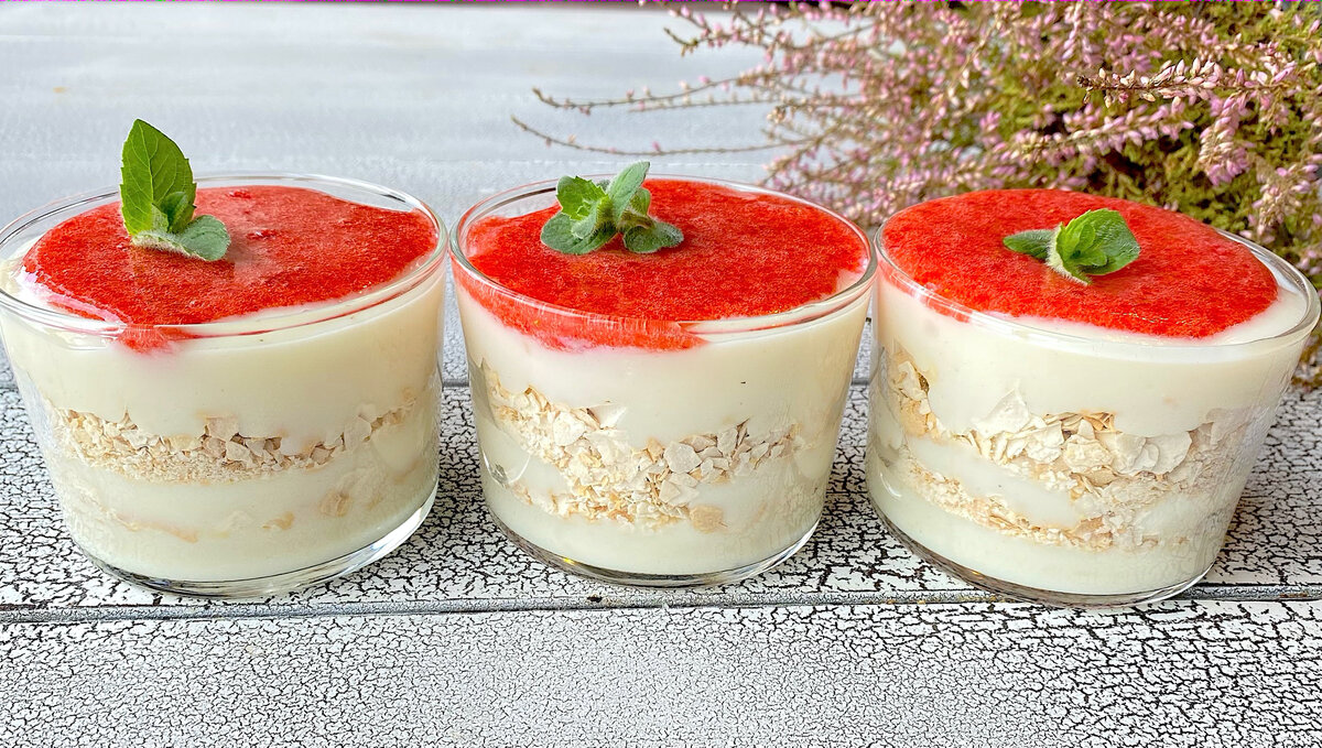 5. Остывший заварной крем выложить в небольшие чашки, чередуя его с крошкой из лаваша. Повторить слои, завершив клубничным пюре и украсив свежей мятой.