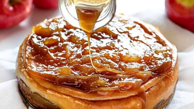 Готовьте карамельный топпинг, смешав карамельный соус с дополнительным яблочным пюре на медленном огне. Перемешайте до однородности и аккуратно выложите на остывший чизкейк.