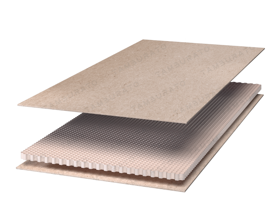 Тамбурат — это инновационный плитный композит, состоящий из внешних слоев, выполненных, как правило, из древесных плит (на основе МДФ, ЛДСП или ХДФ), и внутреннего сотового наполнителя из картона. Эта конструкция обеспечивает ему прочность и легкость, что делает тамбурат привлекательным для различных применений.