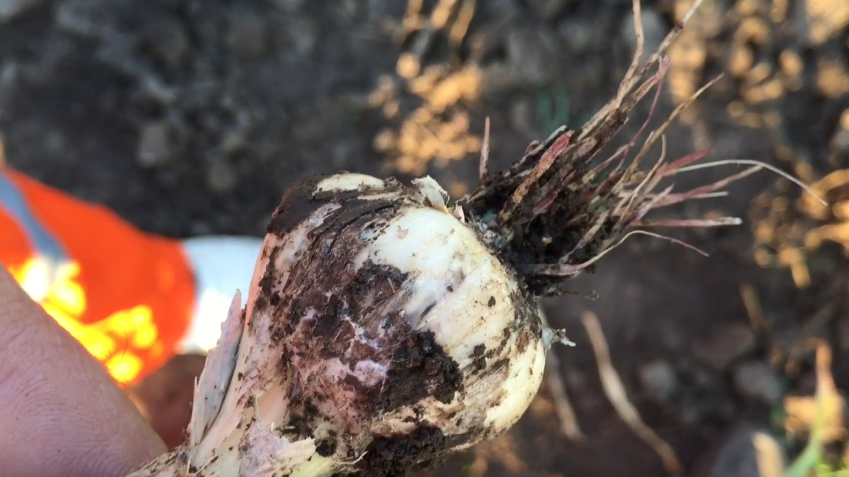 Когда листья чеснока начинают желтеть, это также сигнал к действию. Во втором заходе следует использовать вилы — они более щадящие, чем лопаты, и не повреждают луковицы.