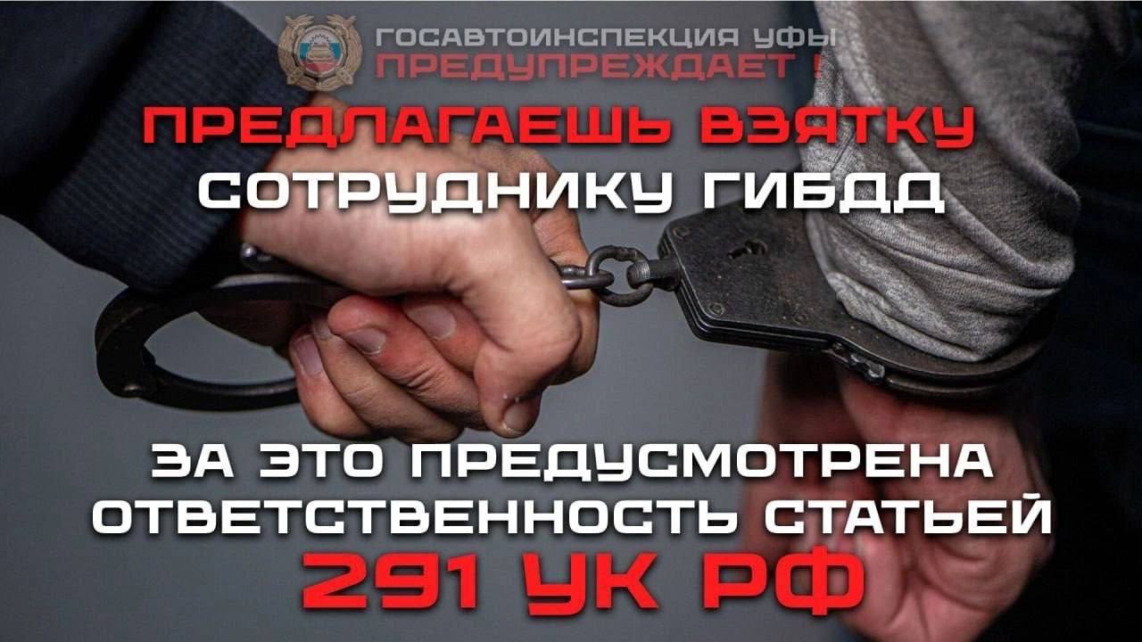 Госавтоинспекция Уфы предупреждает о том, что дача взятки должностному лицу является уголовно- наказуемым деянием и за это можно лишиться свободы