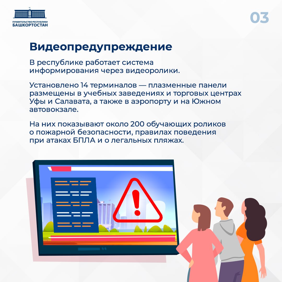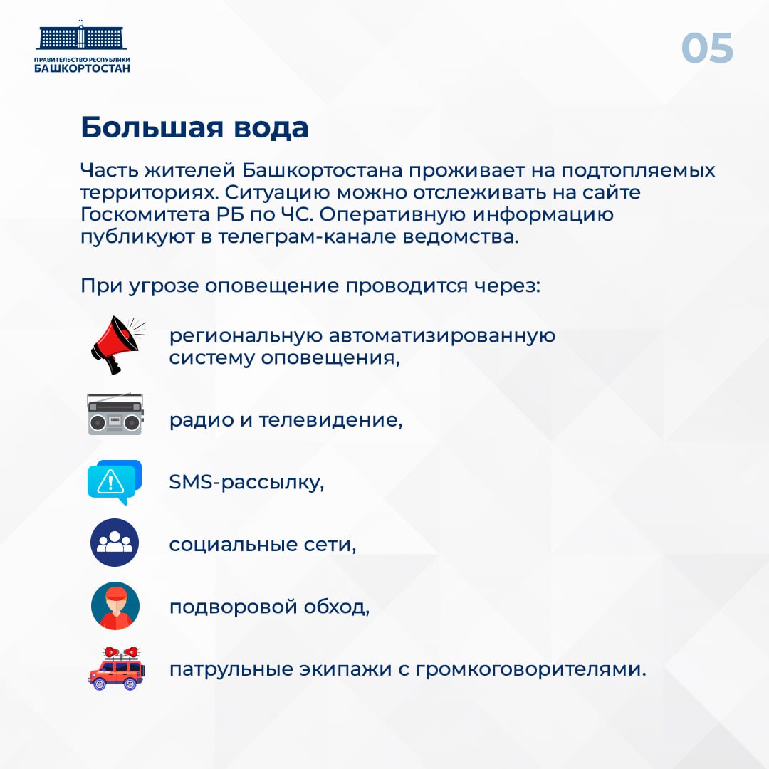 В Башкортостане действует механизм оповещения населения об опасных погодных явлениях, пожароопасном и паводковом периодах, а также о введении и отмене режима беспилотной опасности. На телефоны отправляют SMS с информацией. А если установлены приложения «112 — Экстренная помощь» и «МЧС России», то уведомления можно получить и в них. Ознакомьтесь с информацией о том, как оперативно получать информацию о ЧС