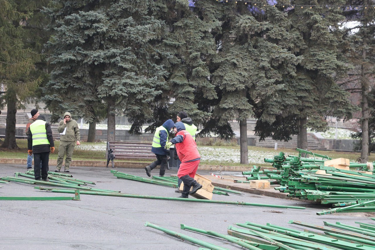 Первую живую елку уже можно увидеть у входа в парк «Волна», а на площади Ленина начался монтаж 30-метровой пиксельной ели.