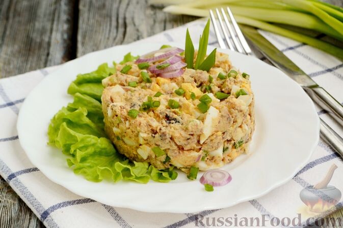 - Салат с сардинами, яйцами и луком: Простой, но сытный, этот салат удивит вас пикантностью благодаря оригинальной заправке из йогурта и специй.