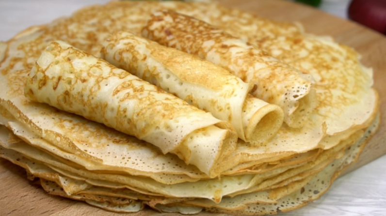 - Блины на кипятке с необычной начинкой: Этот рецепт передается из поколения в поколение. Чтобы его приготовить, вам потребуется 500 мл молока, 3 яйца, 4 ст. ложки сахара и 250 г муки.