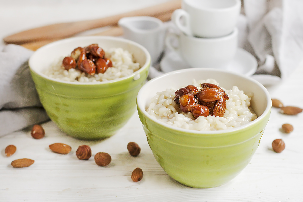 Готовую рисовую кашу разложите по тарелкам и украсьте орехами в карамели для завершения блюда. Подавайте горячим и наслаждайтесь неповторимым вкусом!