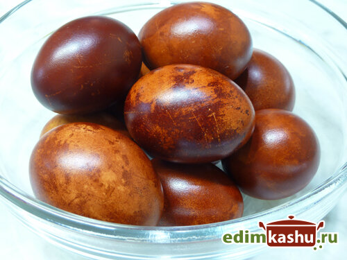 Шелуху поместить в кастрюлю, залить водой и добавить яйца, стараясь равномерно распределить их среди шелухи. Так они будут покрыты красителем со всех сторон, что даст красивые эффекты на поверхности. Затем кастрюлю ставят на огонь и варят яйца около 10 минут. После этого можно оставить их в горячей воде еще на 5-10 минут для достижения лучшего эффекта.