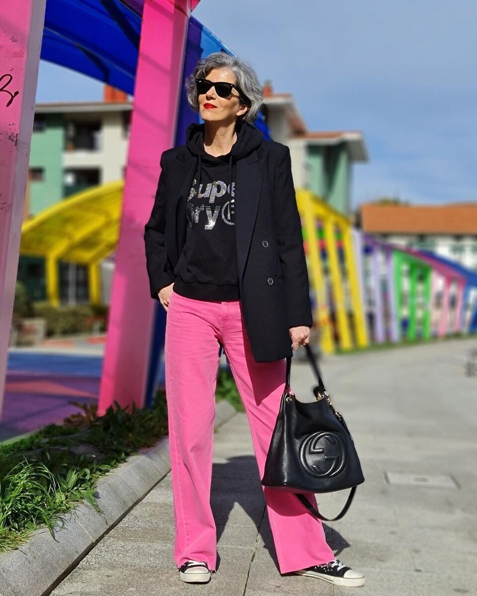 - Розовый низ: Розовые джинсы прямого кроя отлично смотрятся в сочетании с черной толстовкой и классическим жакетом. Это создает сбалансированное сочетание, не позволяя образу превратиться в "барби".