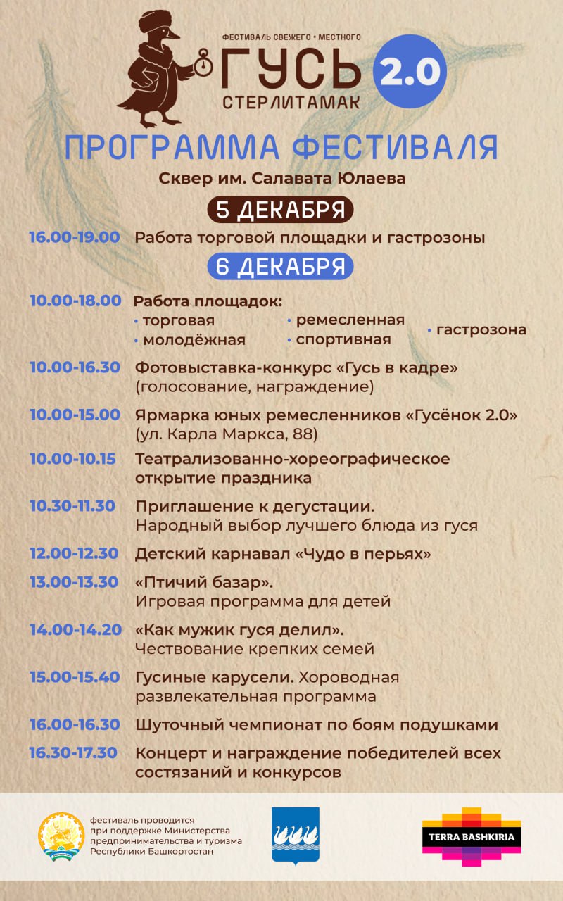 Помимо гастрономической и торговой зоны, для жителей и гостей Стерлитамака будут работать спортивная и молодёжная площадки, пройдёт детский карнавал «Чудо в перьях», а также игровая программа «Птичий базар». Вы станете зрителями и активными участниками интерактивного представления «Как мужик гуся делил», где можно будет узнать о старинных обычаях, поделиться историями о семейных ценностях и познакомиться с крепкими семьями Стерлитамака.