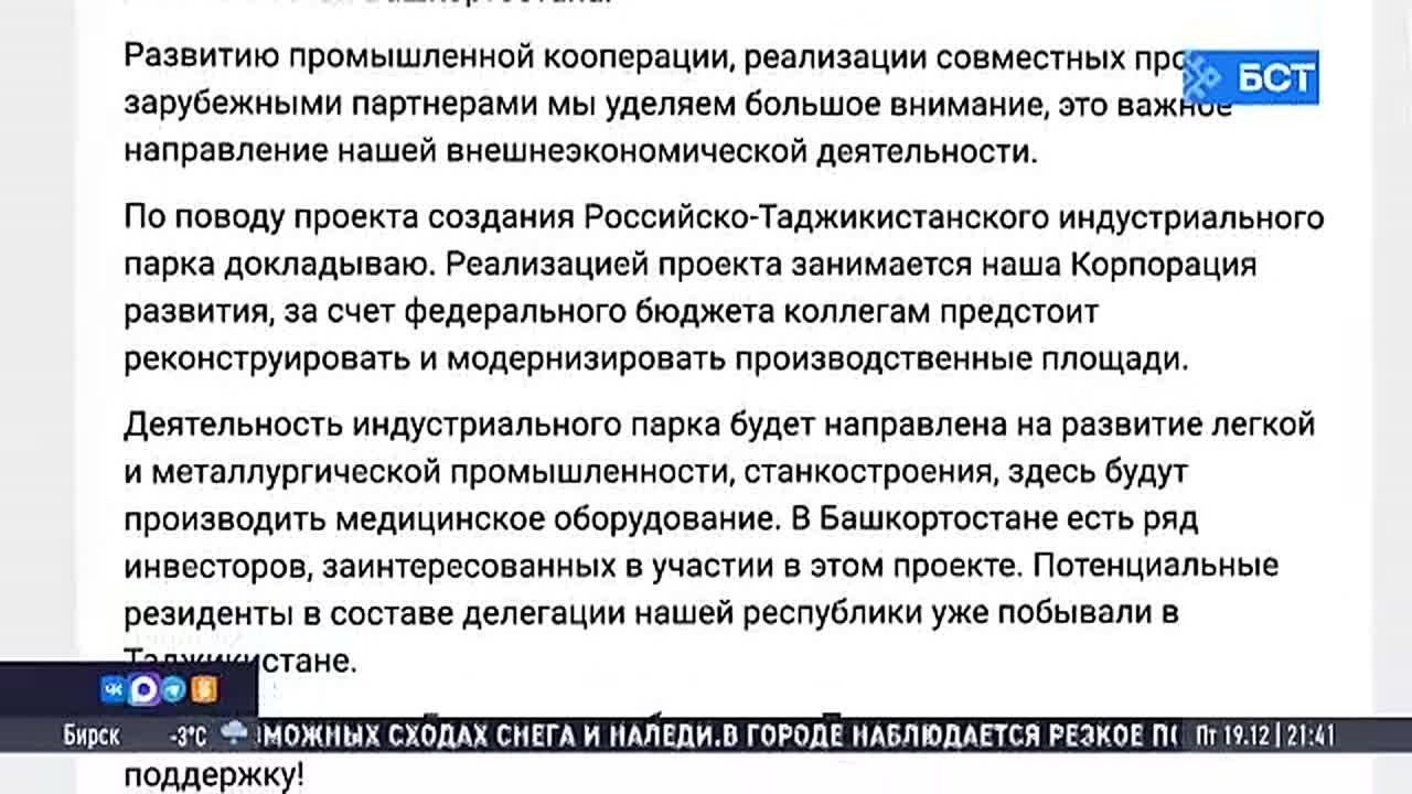Радий Хабиров поблагодарил Президента Владимира Путина за высокую оценку работы и возможностей региона. Глава Башкортостана рассказал в соцсетях о проекте создания Российско-Таджикистанского индустриального парка. Его деятельность, по словам Радия Хабирова, будет направлена на развитие легкой и металлургической промышленности, станкостроения, там будут производить медоборудование.
