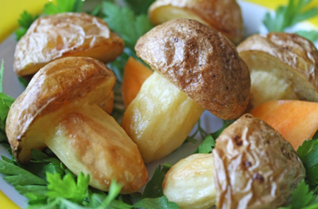 Далее необходимо аккуратно нарезать картошку до надреза небольшими полосками, что придаст ей форму грибочка. Противень застилается фольгой, на него выкладывается подготовленный картофель, который нужно приправить солью, перцем и, по желанию, любимыми специями. Не забудьте смазать все растительным маслом и поместить в предварительно разогретую до 200 градусов духовку в течение 50 минут.